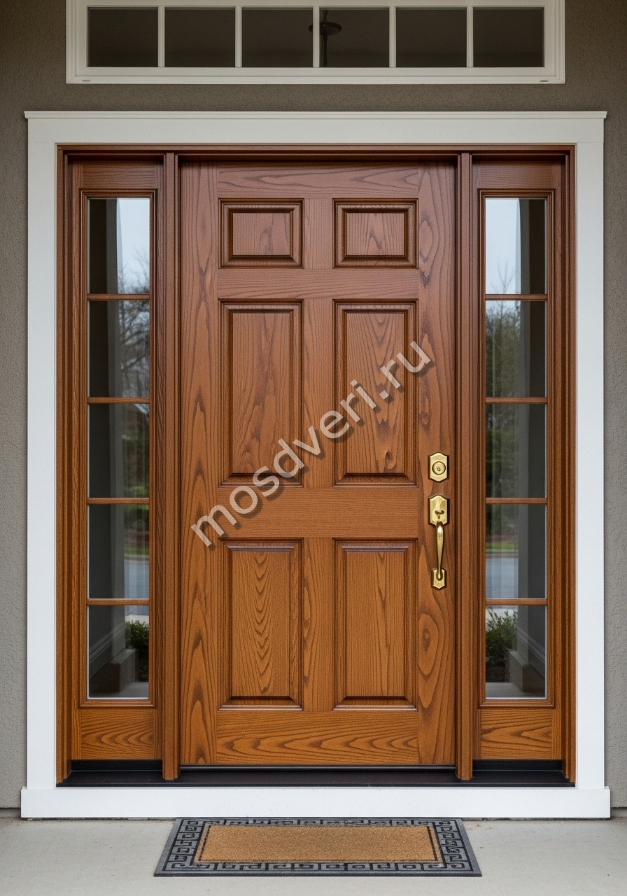 Высокая входная дверь в частный дом коричневая со стеклом c двух сторон — сочетает в себе современный дизайн и максимальную защиту.